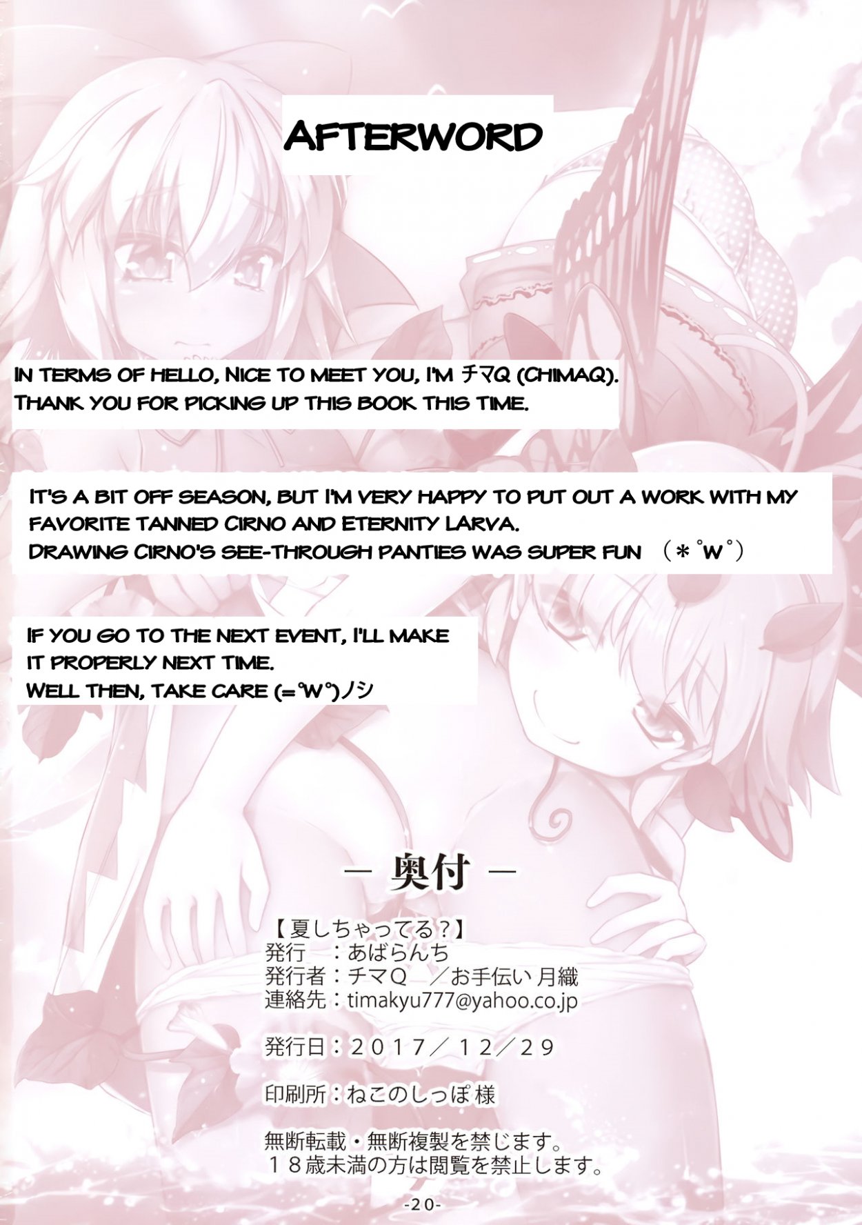 Natsu Shichatteru? Artist:chimaq Parody: touhou project Tags: fairy, tanlines (C93) [Avalanche (ChimaQ)] Natsu Shichatteru? (Touhou Project) [English] [Shephipster] Thumb Full size Added byalinam 22 pages 32 479 11 Sep 2019 Add to Favorites +3339 3